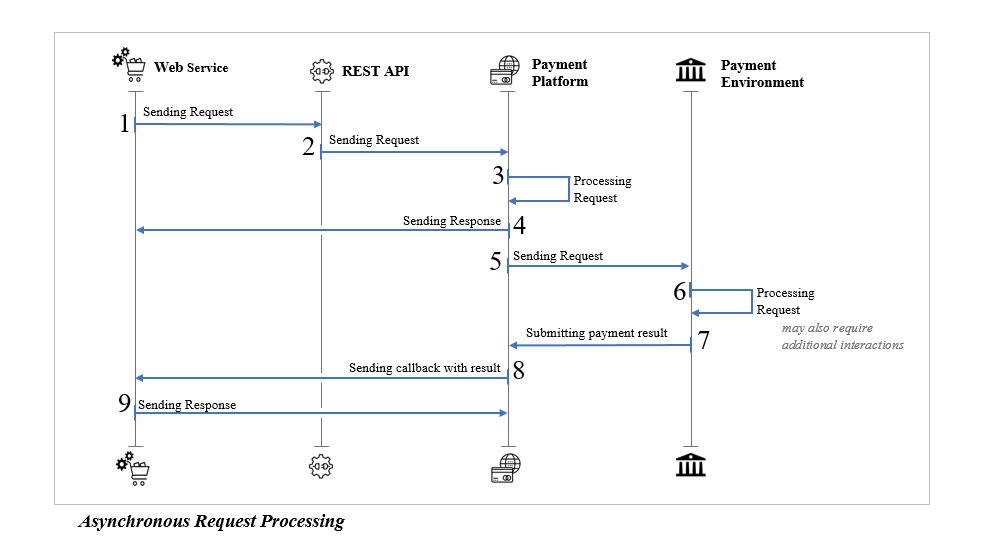 The interaction model supports two interaction models: Viz. Synchronous and Asynchronous. If the payment platform is able to respond to request without resorting / depending to any third parties such as customer or external payment system, it uses the synchronous model; otherwise the payment platform uses the asynchronous model.