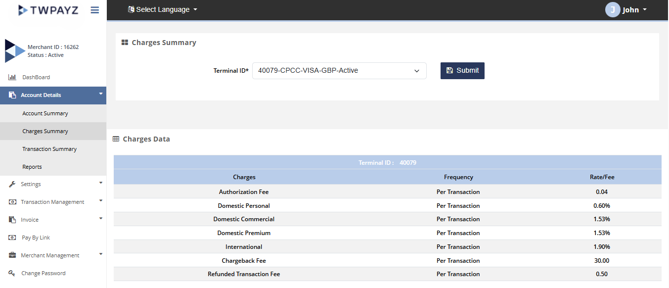 After Login you need to click on Charges Summary section under Account Details tab in the left navigation bar of Merchant’s back office.