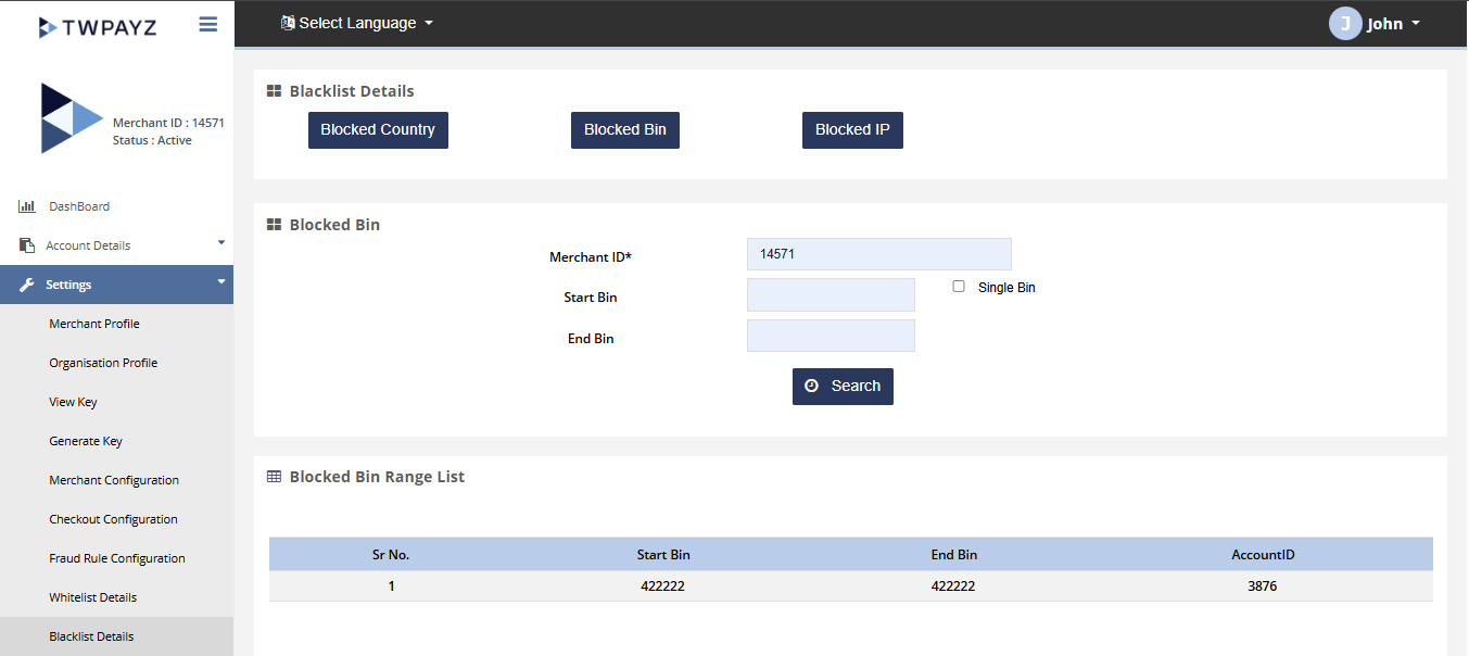 After login you need to click on "Blacklist Details" section under "Merchant Settings" tab in the left navigation panel of Merchant's back office. On the resulting page click on Blocked Bin button.