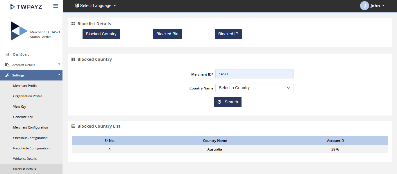 After login you need to click on "Blacklist Details" section under "Merchant Settings" tab in the left navigation panel of Merchant's back office. On the resulting page click on "Blocked Country" button.