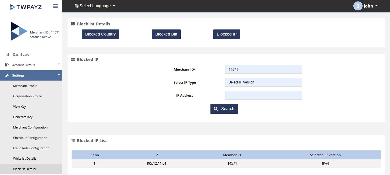 After login you need to click on "Blacklist Details" section under "Merchant Settings" tab in the left navigation panel of Merchant's back office. On the resulting page click on Blocked IP button.