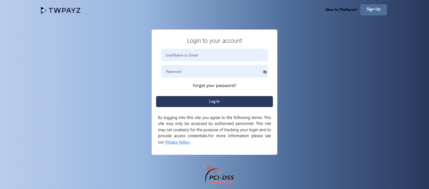 To access the Backoffice, username and password are required. This information will be provided after you sign up with .