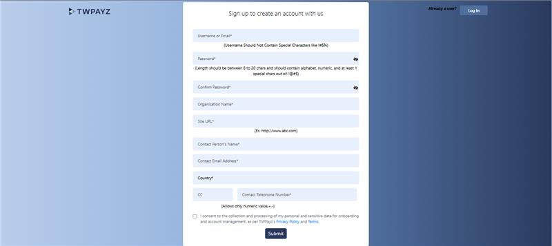 You can directly go on merchant's login page with https:///merchant/index.jsp. After clicking on "Create an account" button you can find the sign up form with below fields: