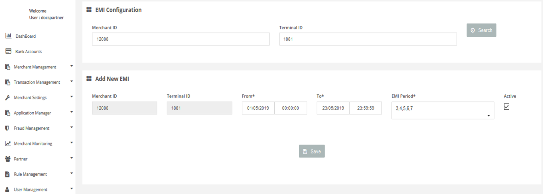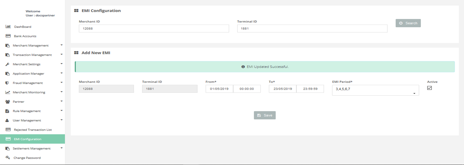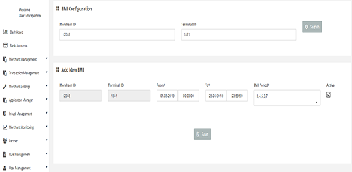 After login you need to click on "EMI Configuration" tab in the left navigation panel of partner's back office.