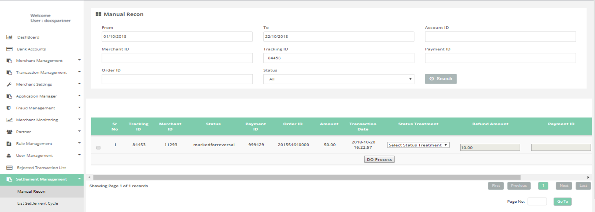 In order to do a Manual Recon, select the record, select ‘Status Treatment’ along with Refund Amount/ Payment ID /Remark wherever required.
