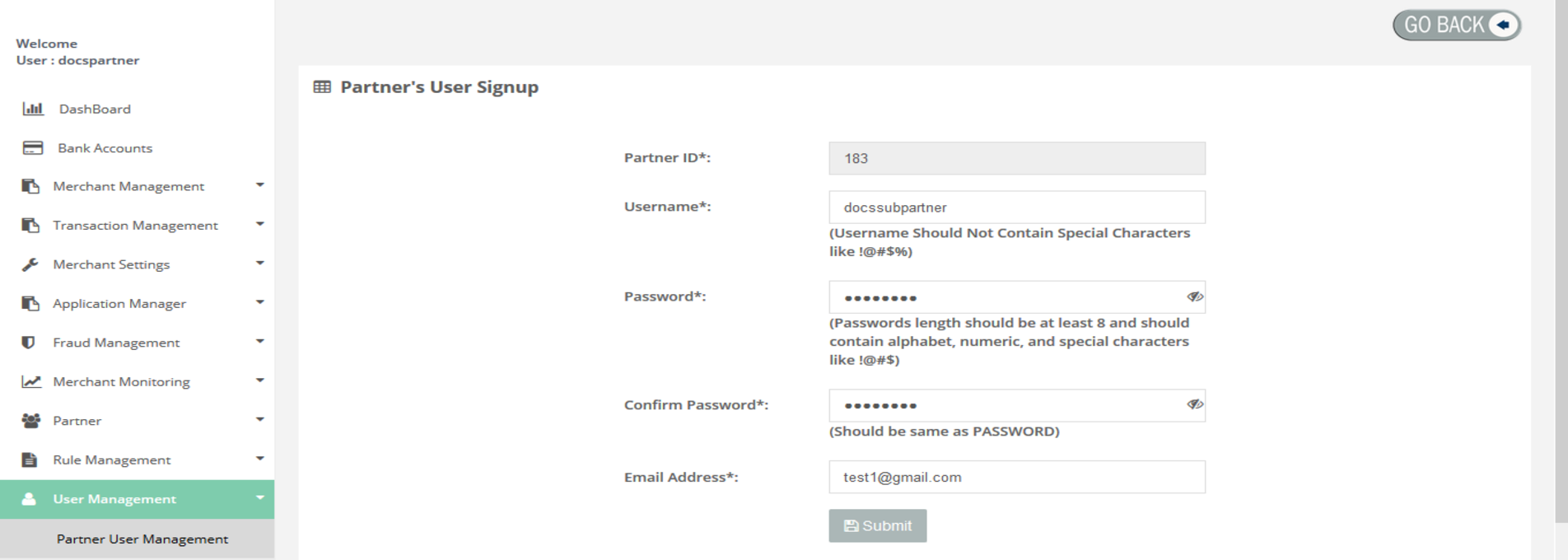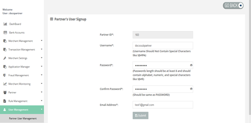 User Management > Partner User Management