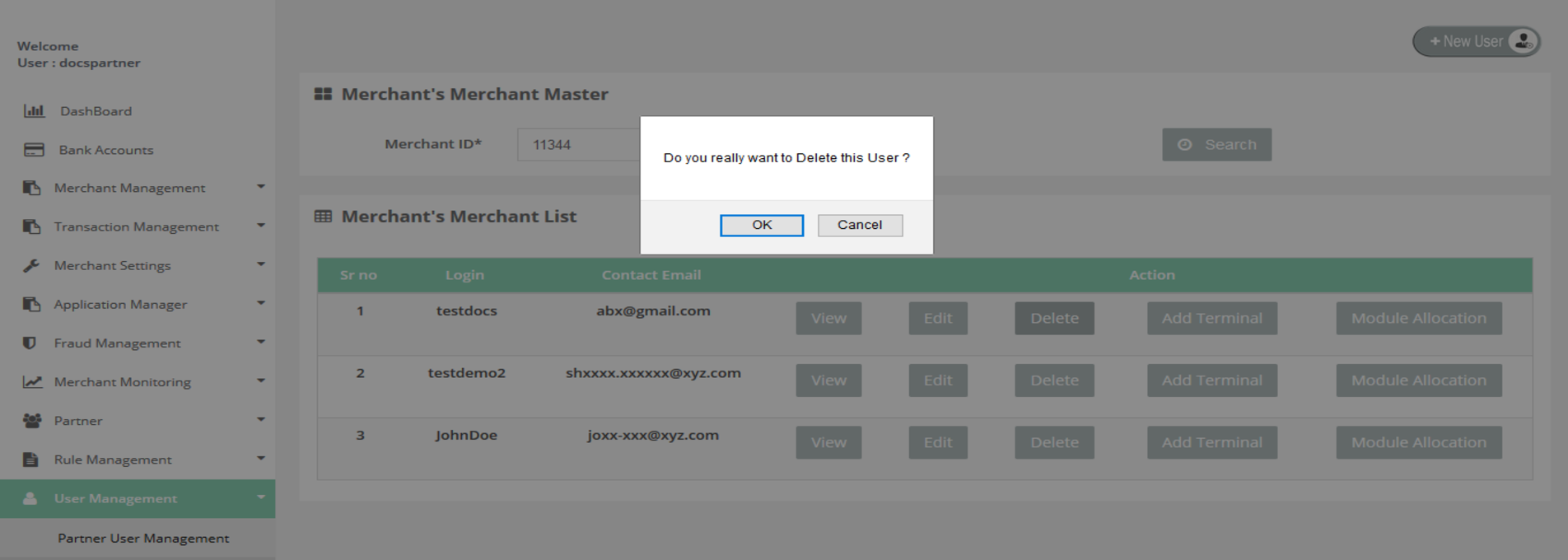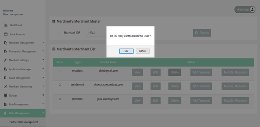 To delete the merchant's details go to the "User Management" section. Then you have to click on search to get the list of users which allows you to "Delete" the user details by clicking on "Delete" button.