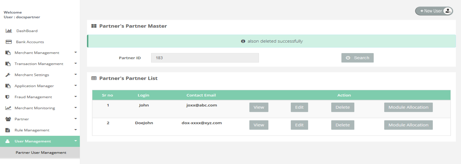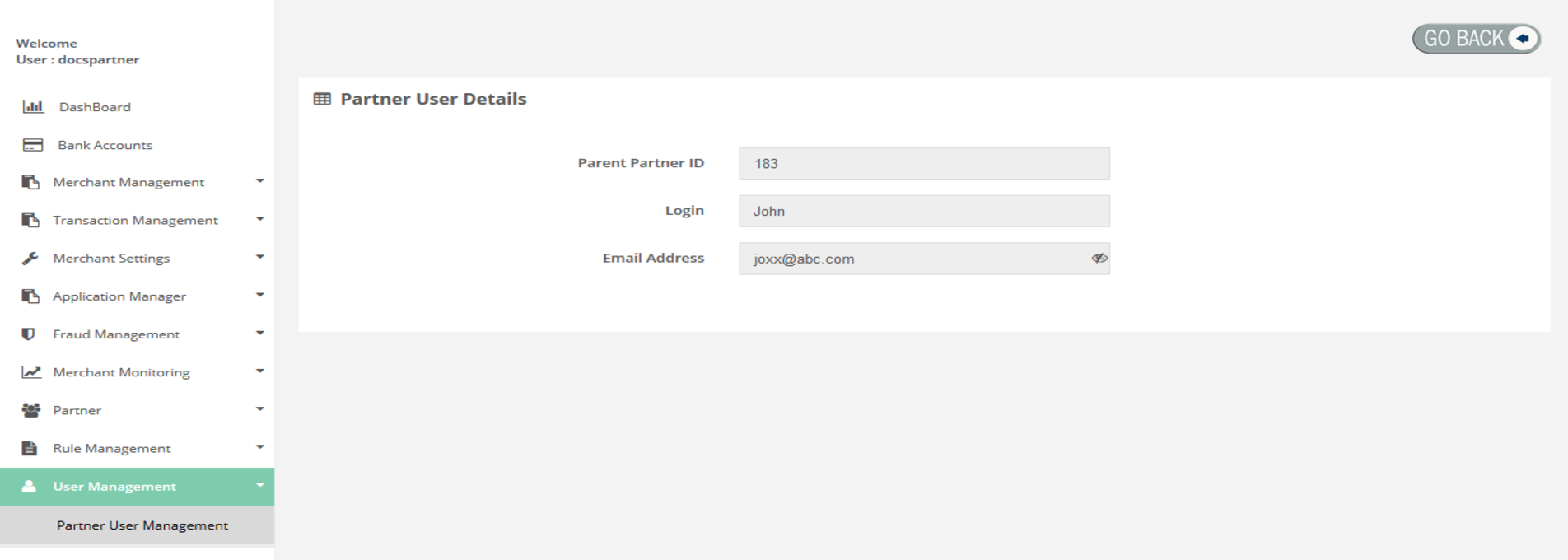 Partner User Management > View Partner User