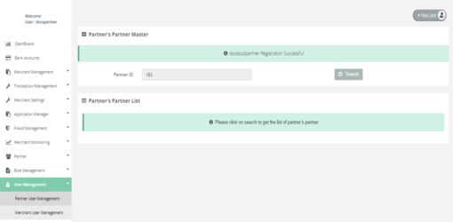 After Login, you need to click on the "Partner User Management" section under "User Management" tab in the left navigation panel of Partner's back office and then you need to click on "Add New User" button which is situated at rightmost top of the search filter.