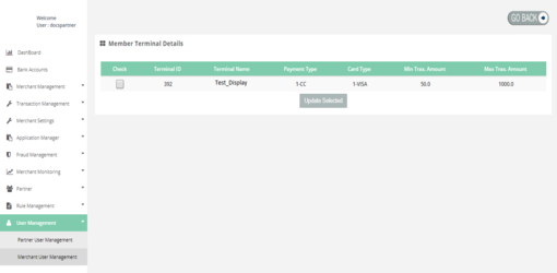 To allocate the terminal to the user go to the User Management section. Then you have to click on search to get the list of users which allows you to "Add Terminal" the user details by clicking on "Add Terminal" button.