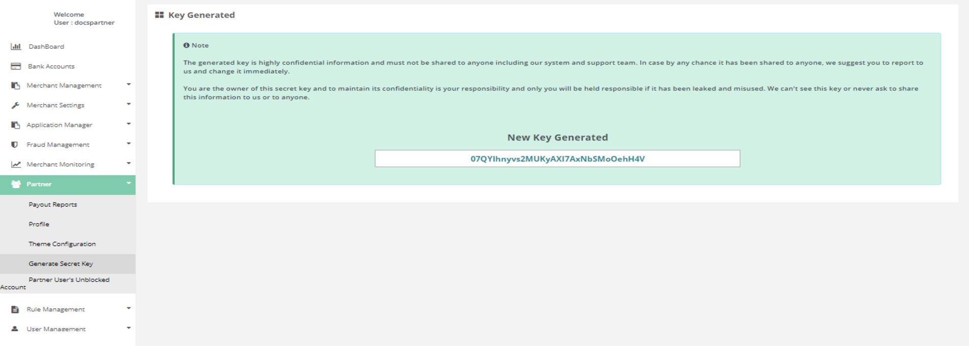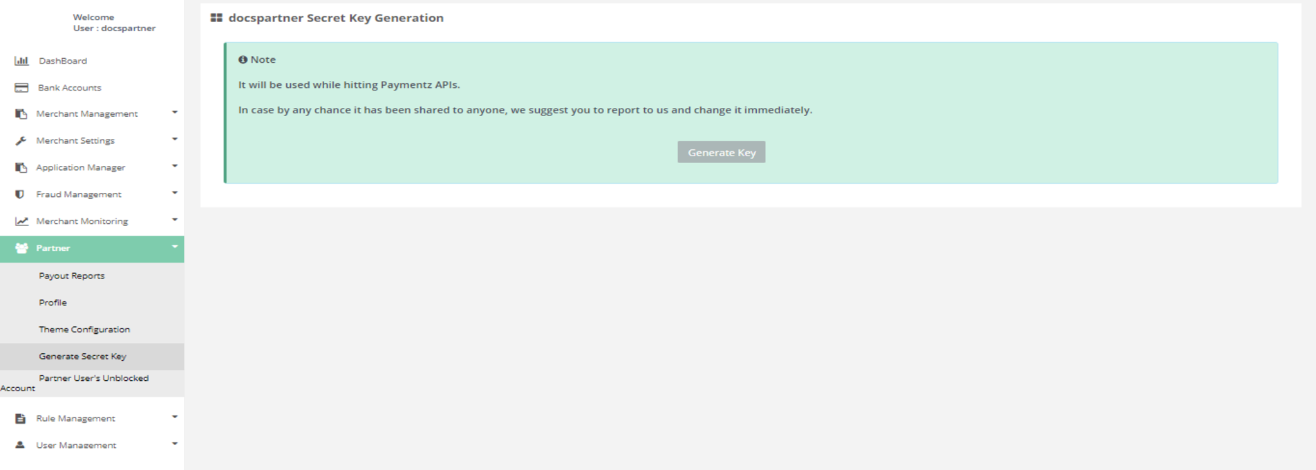 After Login you need to click on "Generate Secret Key" tab in the left navigation bar of Partner's back office.