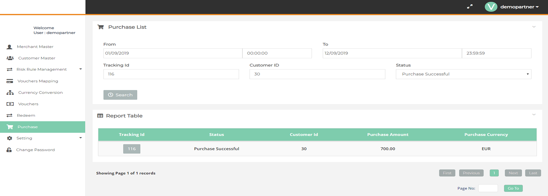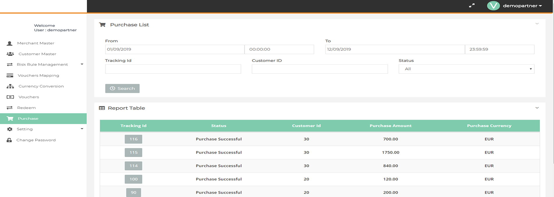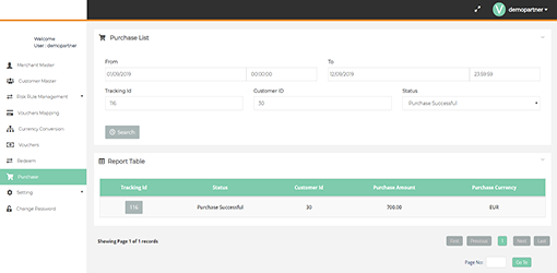 In this page you can view the Purchased Vouchers Details, also you can export the voucher list to excel.