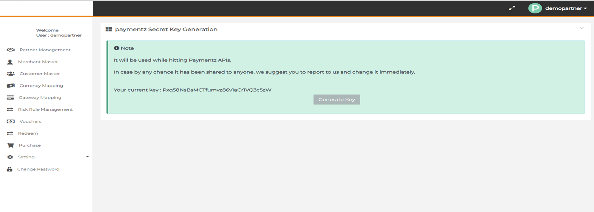 After login you need to click on "Generate Secret Key" section under "Settings" tab in the left navigation panel of Partner's back office.